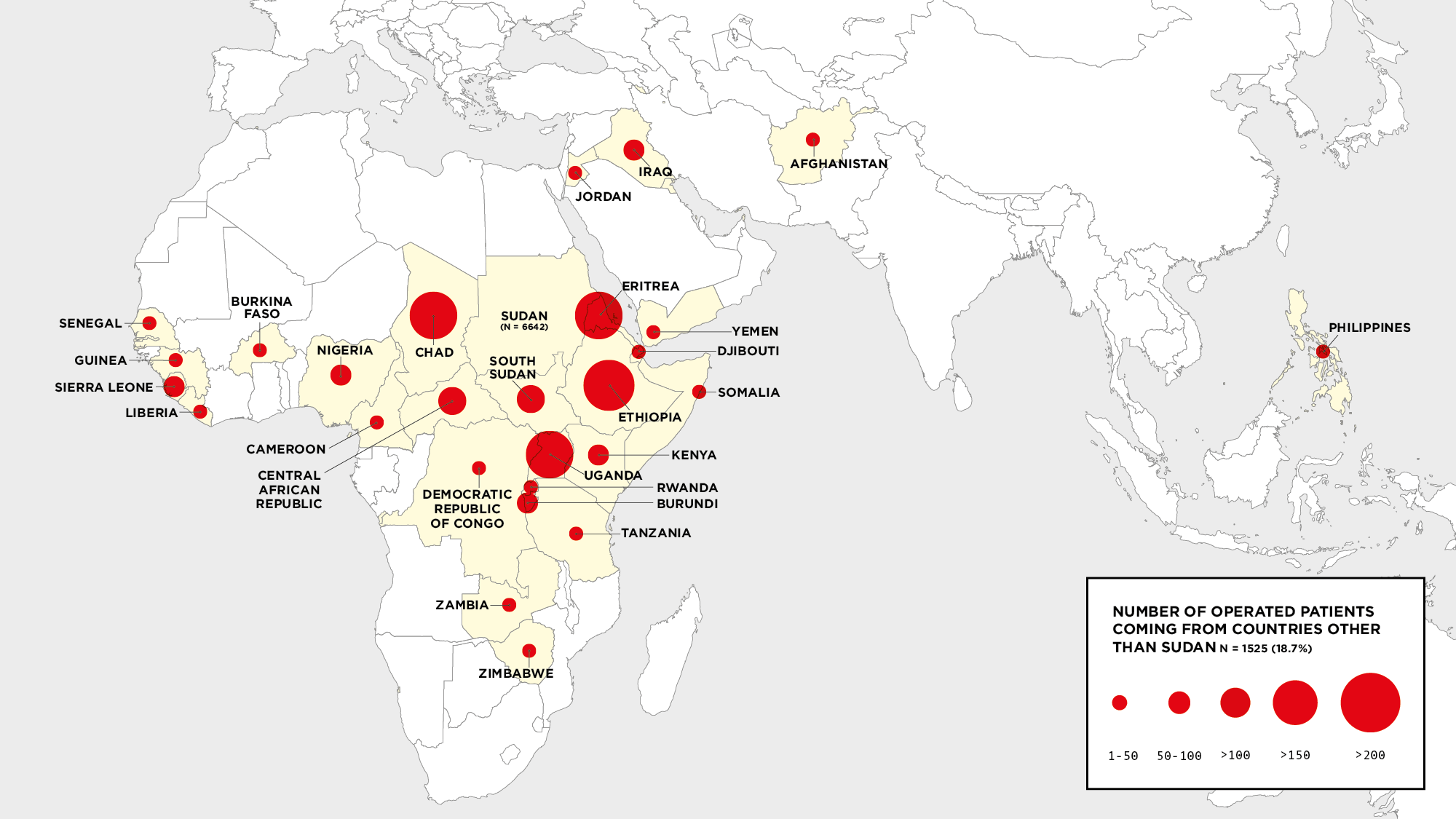 Patients from 33 different countries have been operated on at the Salam Centre, including Afghanistan, Bangladesh, Burkina Faso, Burundi, Cameroon, Central African Republic, Chad, Democratic Republic Of Congo, Djibouti, Eritrea, Ethiopia, Gambia, Jordan, Guinea, Iraq , Italy (* Italian Citizens Temporarily Resident in Sudan), Kenya, Liberia, Libya, Nigeria, Philippines, Rwanda, Senegal, Sierra Leone, Somalia, South Sudan, Sudan, Tanzania, Togo, Uganda, Yemen, Zambia, Zimbabwe.